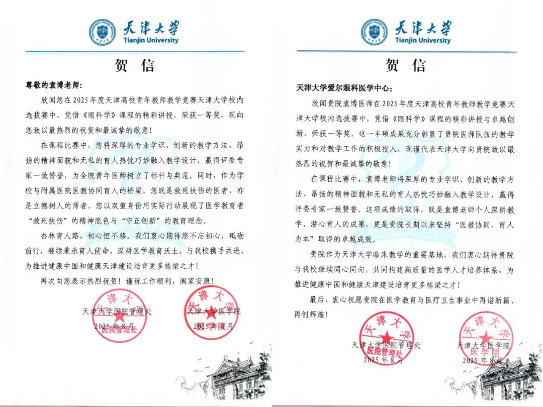 在第41个全国教师节来临之际,天津大学医学院隆重举行“师者如光 医路芳华”优秀教师表彰大会。bv伟德国际1946张婉君主任、梁伟彦医生、袁博医生凭借出色的教学及管理表现荣获表彰。 其中,bv伟德国际1946张婉君主任荣获天津大学第二届“优秀临床教学管理干部”荣誉称号。角膜眼表科梁伟彦医生荣获天津大学第二届医学本科见习“优秀带教老师”荣誉称号。屈光手术中心袁博医生,在2025年度天津高校青年教师教学竞赛天津大学校内选拔赛中,凭借《眼科学》课程的精彩讲授,荣获一等奖。杏林育人路,初心恒不移。此次表彰不仅是对三位个人教学及管理成就的高度认可,更是对bv伟德国际1946长期以来坚持高质量教学、持续创新人才培养模式的充分肯定。未来,bv伟德国际1946将继续探索更高效、更人性化的教学模式,激励更多教师积极参与医学教育与临床实践的深度融合与协同发展,为培养具有创新精神和实践能力的优秀眼科人才持续贡献“伟德国际力量”,助力医学教育事业蓬勃发展。