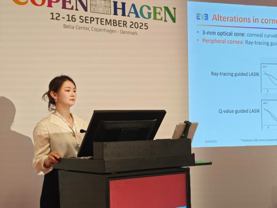研究论文《Impact of postoperative corneal morphology changes in different optical zones on the visual quality after ray-tracing guided LASIK》(光线追踪引导LASIK术后不同光学区角膜形态变化对视觉质量的影响),凭借创新性设计与扎实临床数据,成功斩获大会发言资格。会上,赵波院长作为通讯作者主导研究设计与质量把控,第一作者袁博博士代表团队登台汇报,清晰阐述研究背景、技术亮点及临床应用价值,以专业表达赢得现场同行认可。